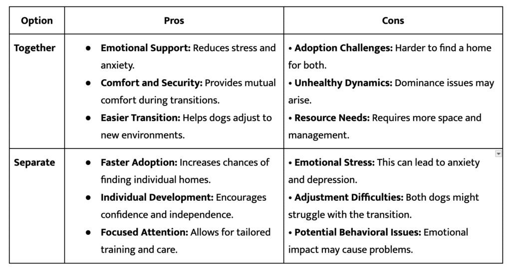 Deciding to keep bonded dogs together or separate them can be challenging. Each option has its pros and cons and the best choice often depends on the specific needs of the dogs involved.